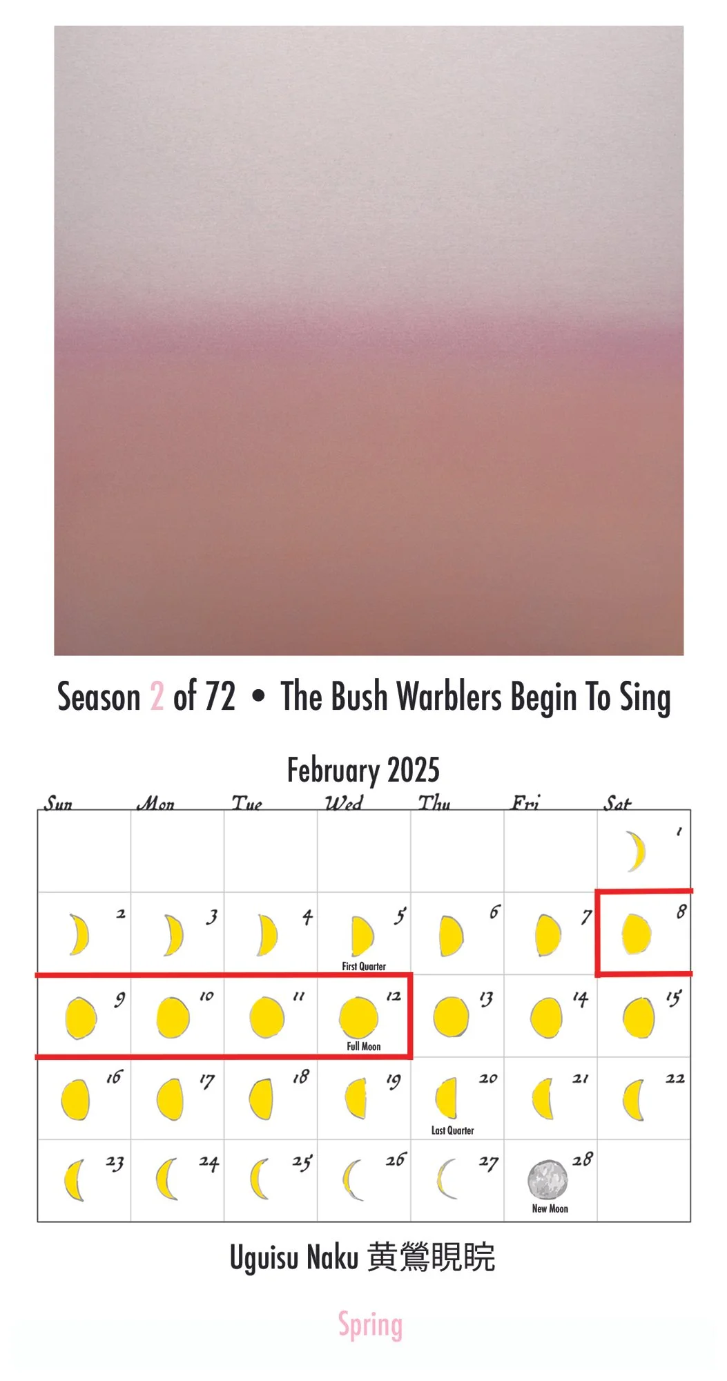 The seventy two microseasons (shichijūni kō, 七十二候) are an ancient, nature based system that divides the year into five or six day intervals. Originating from the Chinese lunisolar calendar more than 2,500 years ago and later refined in 17th century Kyoto, they record what is almost imperceptible: a rainbow after rain, the faint song of insects, a shift in wind, the return of migrating birds, the first frost. These fleeting observations cultivate an awareness of impermanence and reveal the delicate patterns of the natural world. For the past several years, I have created printed annual Microseasons Calendars as an ongoing exploration of time, seasonality, and transience. Each edition translates the seventy two microseasons through a distinct visual language. The 2024 24 & 72 Seasons Blue Sky Calendar pairs the ancient seasonal intervals with photographs of the sky, capturing moments of light and atmosphere that mirror the fleeting nature of each microseason. In contrast, the 2025 72 Seasons in Paintings Calendar reinterprets the cycle through painted color fields, each microseason represented by two traditional Japanese colors historically tied to that time of year and resonating with kigo, the seasonal words used in classical Japanese poetry. Both calendars follow the same structure: seventy two pages, each with a title in English, romaji, and kanji, a Gregorian calendar grid marking the microseason’s five or six day span, moon phases, and a highlighted date range in faint yellow. Beneath the grid, the season number and context, such as “Season 19 of 72 • Early Summer,” indicate its place within the cycle. Continuing my exploration of mono no aware, the recognition of beauty in transience, these calendars invite you to witness subtle seasonal rhythms and experience time as cyclical, alive, and deeply interconnected.