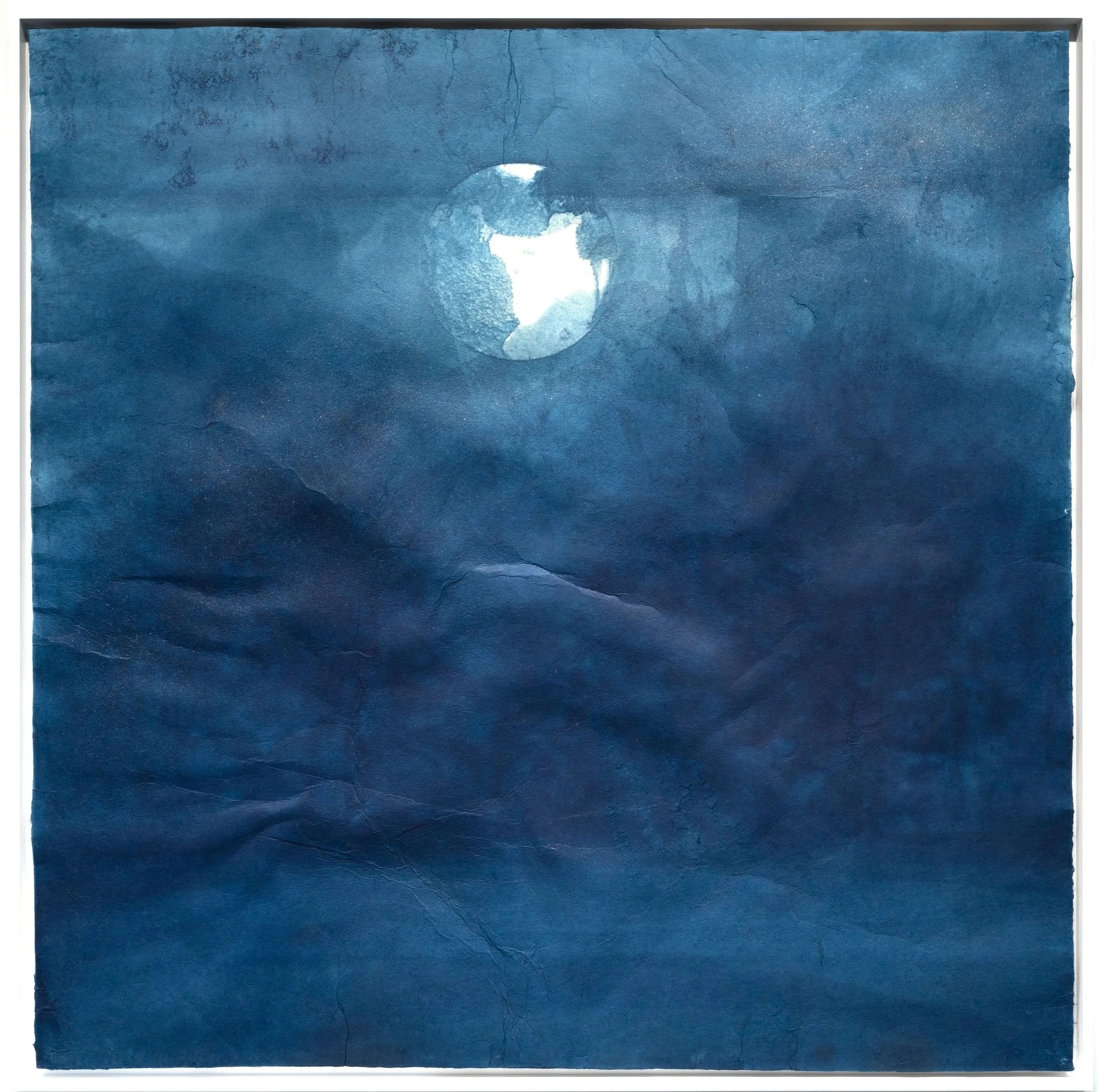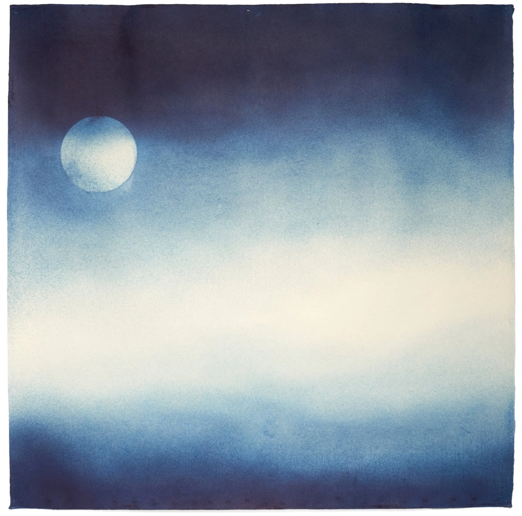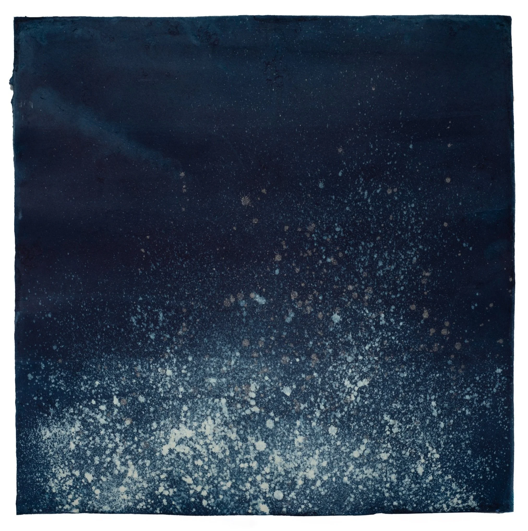 Celestial Observations in Indigo extends from this body of work, expanding the scale of the original drawings. The series presents larger compositions that register transient astronomical phenomena: eclipses, meteor radiants, and shifting lunar phases. Executed in indigo dye on washi paper, these works employ a medium that simultaneously embodies and measures time. Indigo becomes both material and chronometry, a natural clock encoded in color. As it interacts with the paper, the pigment gradually deepens, revealing the passage of time through increasingly darker layers. Lighter indigo represents moments and darker shades mark longer durations.