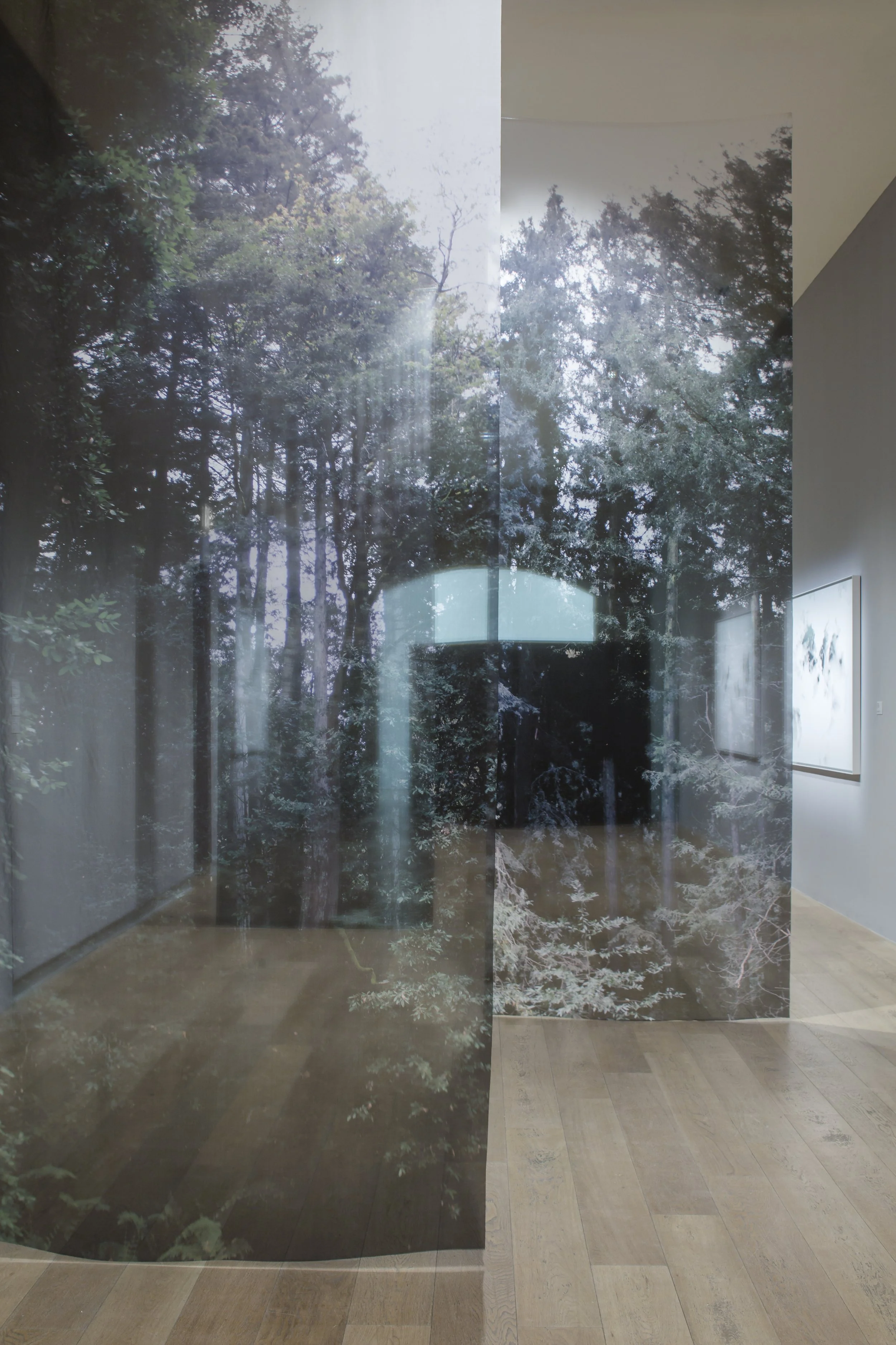 Redwood (Spirit) is an exploration of impermanence, perception, and the interplay between material and atmosphere. The work consists of semi-transparent silk panels printed with photographic images of towering redwood trees, the tallest and among the oldest living organisms on Earth, now diminishing in range and number due to environmental change and human activity. These vertical forms echo both the scale of the trees and the architecture of the space, yet their sheer, weightless surfaces defy solidity, offering a spectral encounter rather than a representational one. The effect is not fixed but spatial and temporal; the viewer moves through its apparition rather than simply observing it. Ando’s use of silk and diaphanous fabric reinforces her interest in liminal states. The material functions as a threshold between visibility and disappearance, between image and experience. Redwood (Spirit) engages with the spirit of place by rendering landscape not as external terrain but as internal condition.