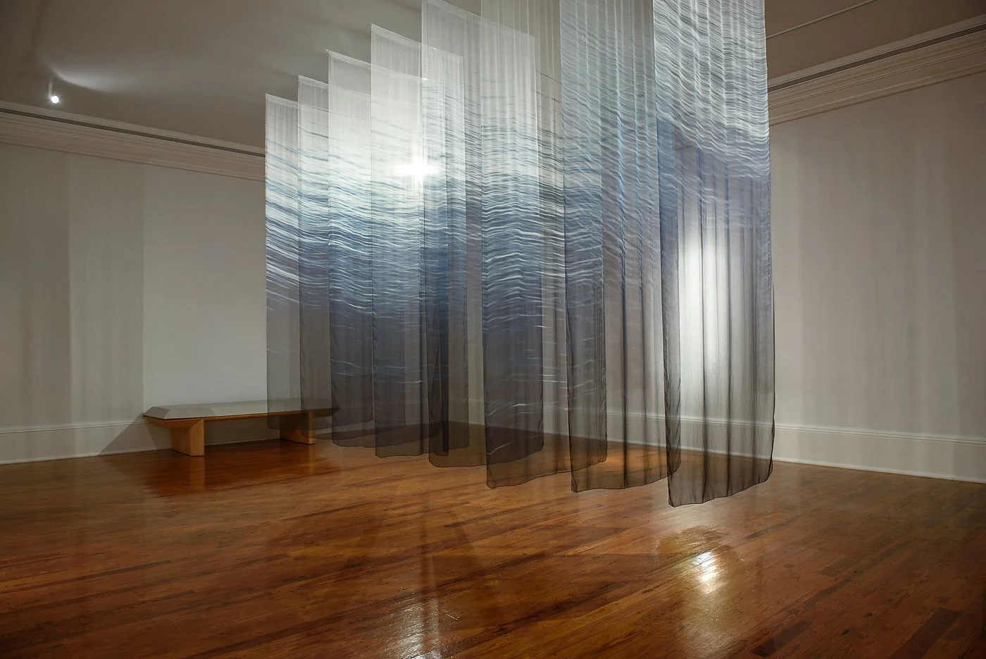 Each diaphanous panel is printed with delicate wave imagery and suspended vertically in parallel layers, creating a translucent corridor of motion and light. As the panels shift, they cast rippling shadows across the space, forming an ever-changing field of perception. The silk behaves like waves: it undulates, dissolves, and appears ephemeral.
