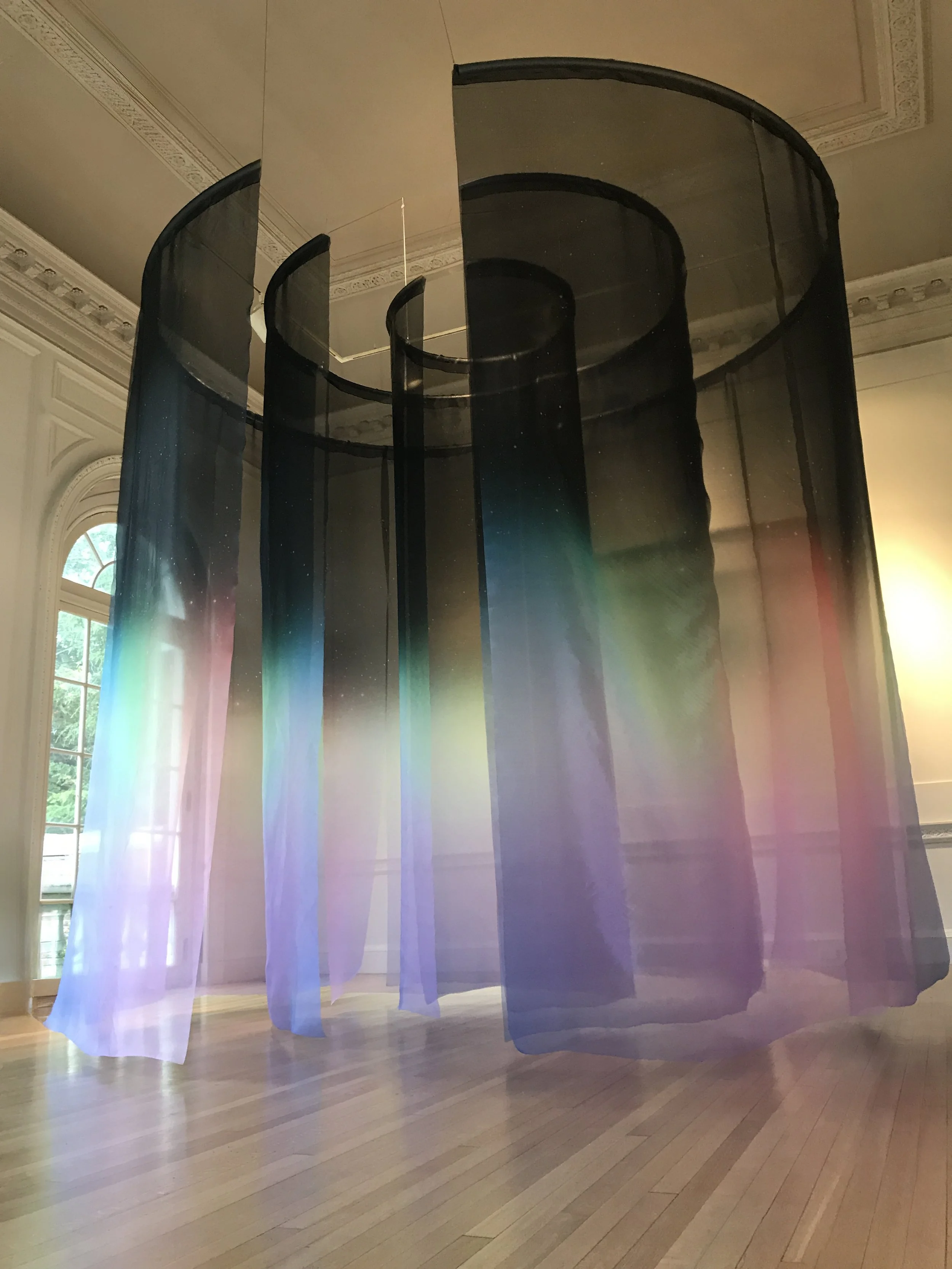 Aurorae was a monumental installation featured in the Nassau County Museum of Art’s 2019 exhibition Energy: The Power of Art. Suspended in the museum’s Mrs. Vincent de Roulet Gallery, the work consisted of translucent fabric hanging from a spiral aluminum structure, measuring approximately 238 x 120 x 120 inches. The installation transformed the gallery into an immersive environment evoking the aurora borealis, as light passed through the fabric and created shifting atmospheric patterns across the space. The result was a meditative, luminous experience that engaged viewers in the intangible beauty of natural phenomena.