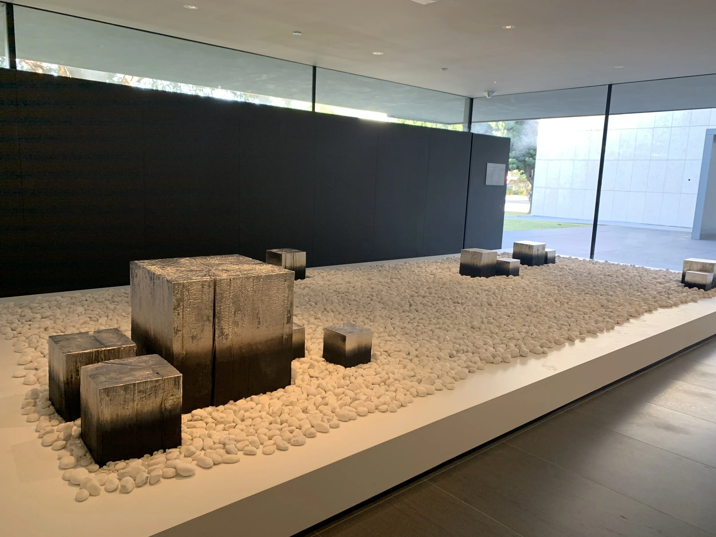 Ando’s installation presents a precisely scaled version of the original garden, replacing each stone with a charred wooden cube made using shou sugi ban, a traditional Japanese method of preserving wood through fire. Treated with silver nitrate, parts of the surfaces reflect and dissolve into their surroundings, registering the passage of light, oxidation, and time. By translating natural stones into minimalist geometric forms, Ando explores the abstraction already latent in the original site. The use of charred wood heightens the sense of temporality and engages the principles of wabi-sabi, particularly its embrace of impermanence, imperfection, and natural transformation.