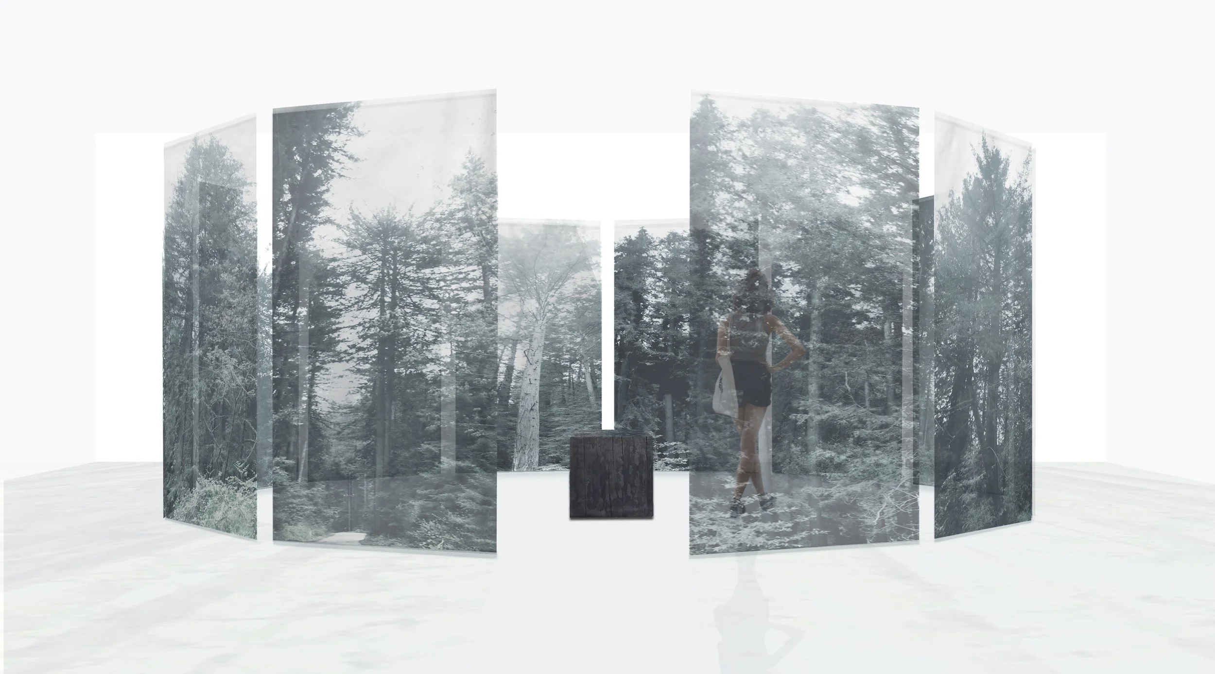 The installation materializes this ecological and symbolic reality through silk chiffon panels. The fabric’s gossamer quality evokes the fragility and ghostlike presence of old-growth redwoods, many of which are disappearing under environmental threats. The piece also serves as a metaphor for human society, examining how survival depends on mutual support, shared resources, and interconnectedness.