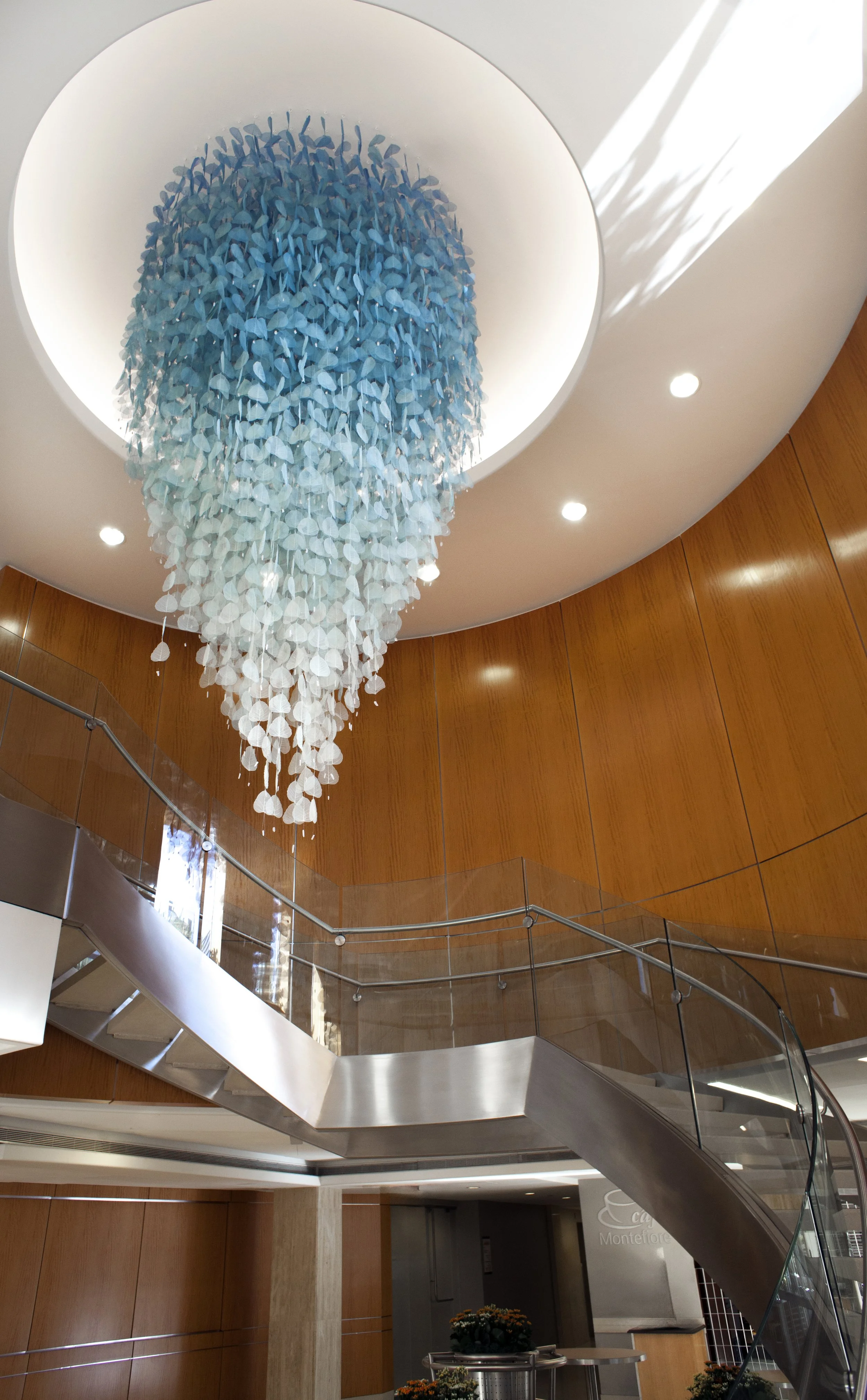 Ascension Leaves is a large scale suspended sculpture installed in 2015 in the atrium lobby of Montefiore Medical Center’s Moses Campus in the Bronx, New York. Commissioned by The Fine Art Program and Collection at Montefiore Einstein, the installation consists of over 6,500 hand dyed Bodhi (Ficus religiosa) leaves, the same species of tree beneath which the Buddha attained enlightenment. The leaves have had their cellulose removed, leaving behind delicate, lace like skeletons. Arranged in concentric circles and suspended on varying lengths of monofilament, they are dyed in a gradient of cerulean blue, with tonal variations determined by the duration of dye immersion. Quartz crystal weights at the bottom of each strand allow the leaves to shift gently in response to ambient air currents, introducing a subtle sense of movement to the space. The sculpture hovers above a circular stairwell and can be experienced from multiple vantage points, both from below and from the upper level. Ando has continued her engagement with healthcare settings through a series of permanent commissions that reflect her interest in creating contemplative spaces for healing and reflection. These include Tides at Memorial Sloan Kettering’s Josie Robertson Surgery Center in New York, Quietness in the nondenominational chapel at San Francisco General Hospital, and a commission for the RCINJ Morris Cancer Center Art Program at Rutgers University.